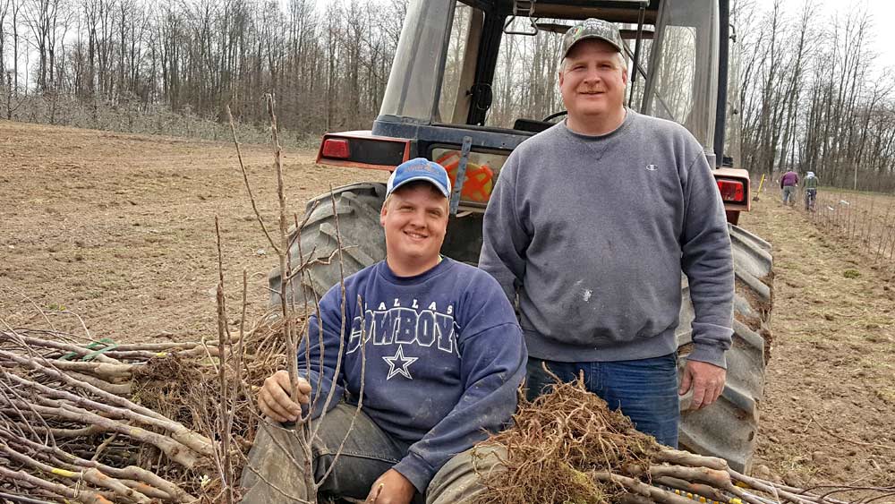 Twin Bee Orchard co-owner Tony Blattner and his son Nathan, left, take a break while planting 4,600 Smitten trees in spring 2016. Twin Bee, in west-central Michigan, has 135 acres of apples, including Gala, Red Delicious, Fuji, Honeycrisp, McIntosh, Empire, Ida Red and Jonagolds. Photo by Twin Bee Orchard LLC.